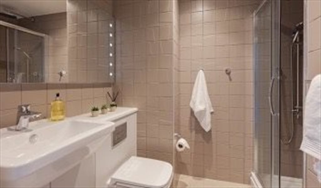 En-suite bathroom with rainfall shower and back-lit mirror;