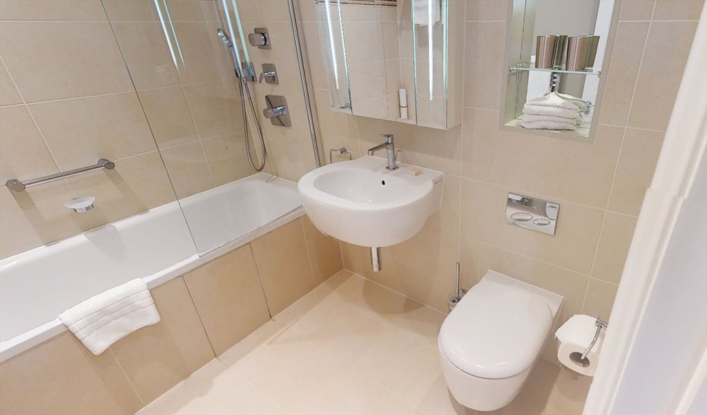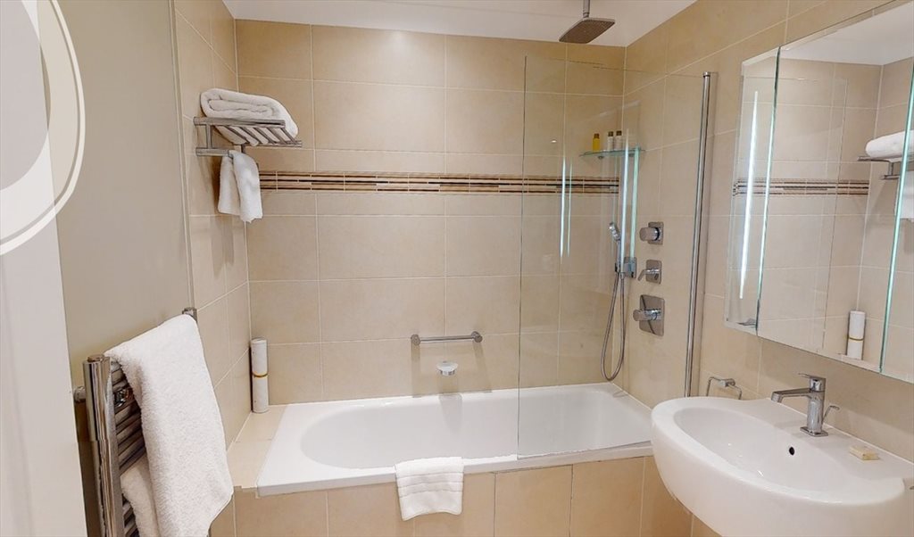 The sleek bathroom is finished to a high standard and includes a walk-in rainfall shower, modern vanity, illuminated mirror, and luxury toiletries, offering a spa-like experience.