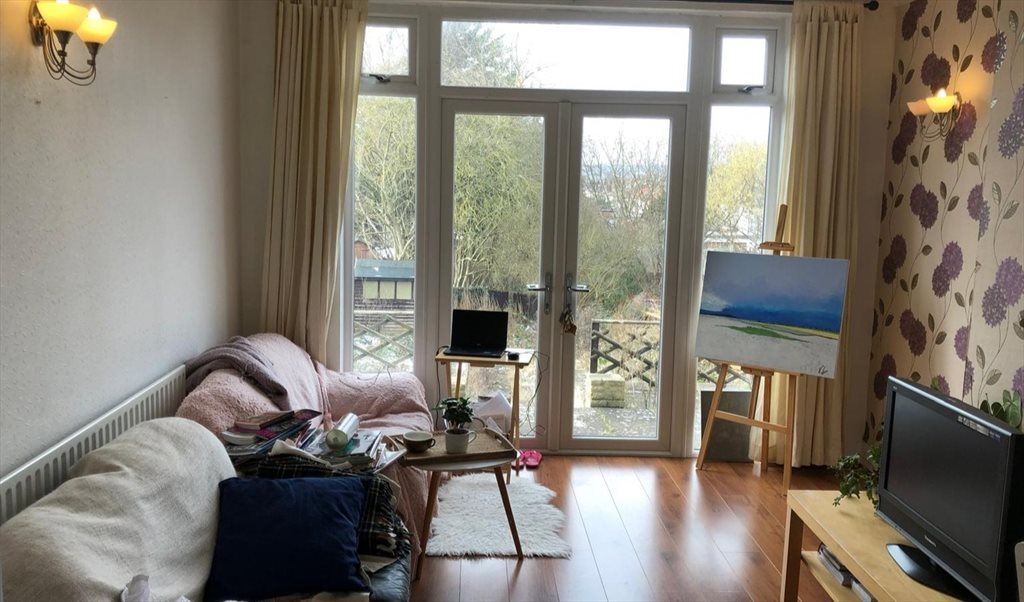 - large living room with tv and patio doors leading to lovely large garden with patio area