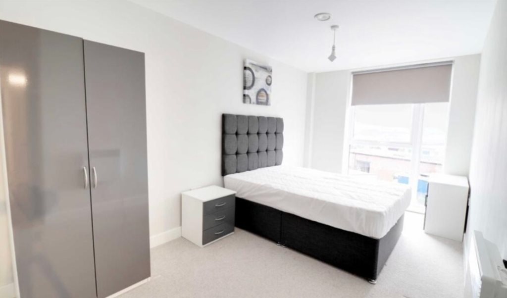 Beautiful and very large double bedroom with large window. Furnished with wardrobe, chest of drawers and side table. Located just two minutes from the nearest tram, and just 18 minutes to Central Manchester. Shared spaces are also furnished. Rent is £620 per month excluding bills.