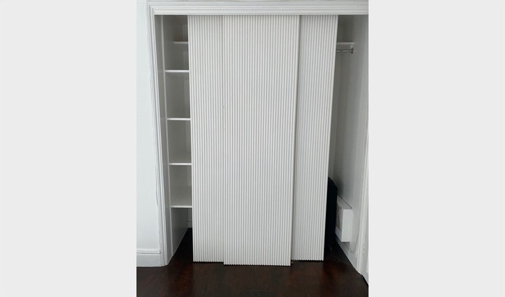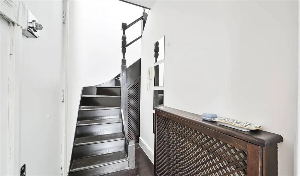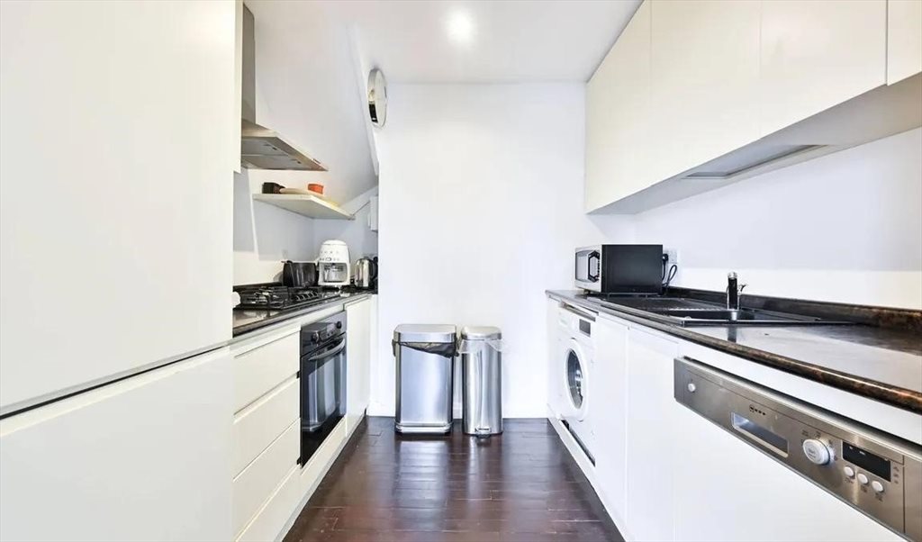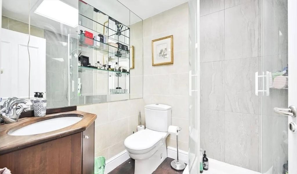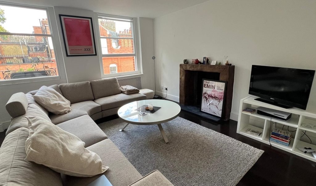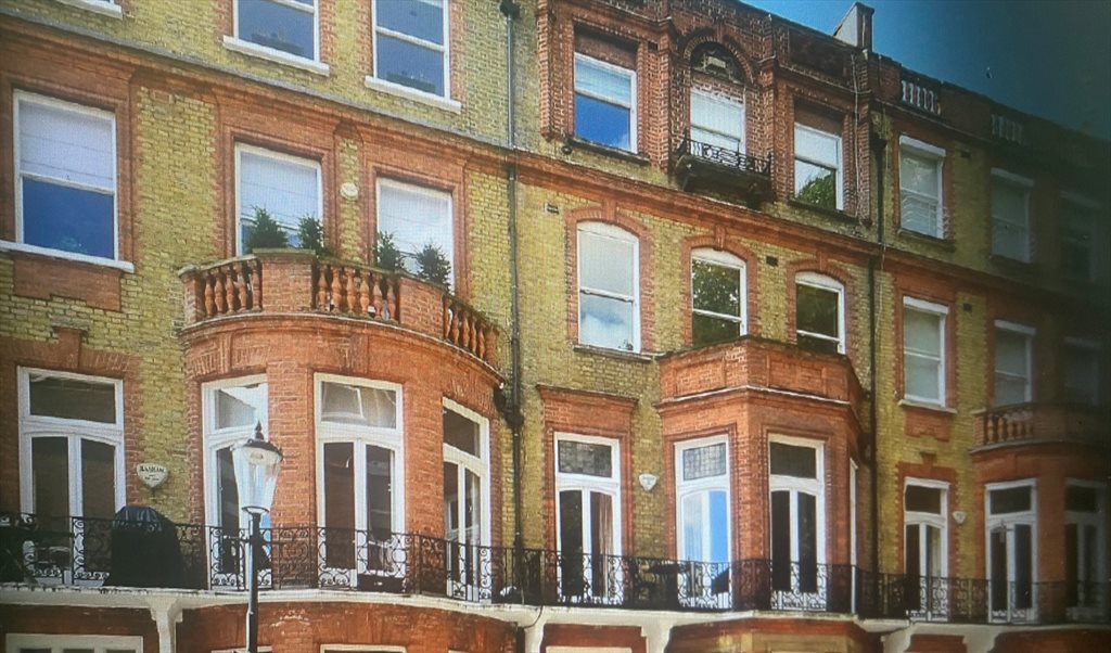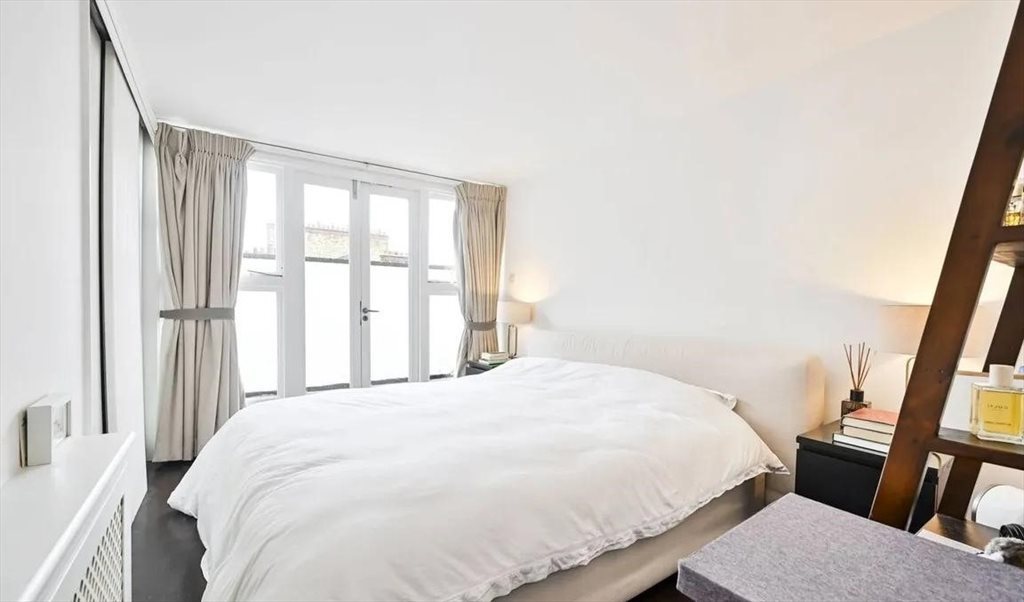 Spacious double bedroom available on the 4th floor of a duplex flat in a mansion block with double doors leading to outside space. The room includes a double bed, bedside tables, fitted wardrobes, and double doors leading to a private roof terrace with stunning views of the garden square. A separate shower and WC are provided. A desk and chair can be provided if needed.