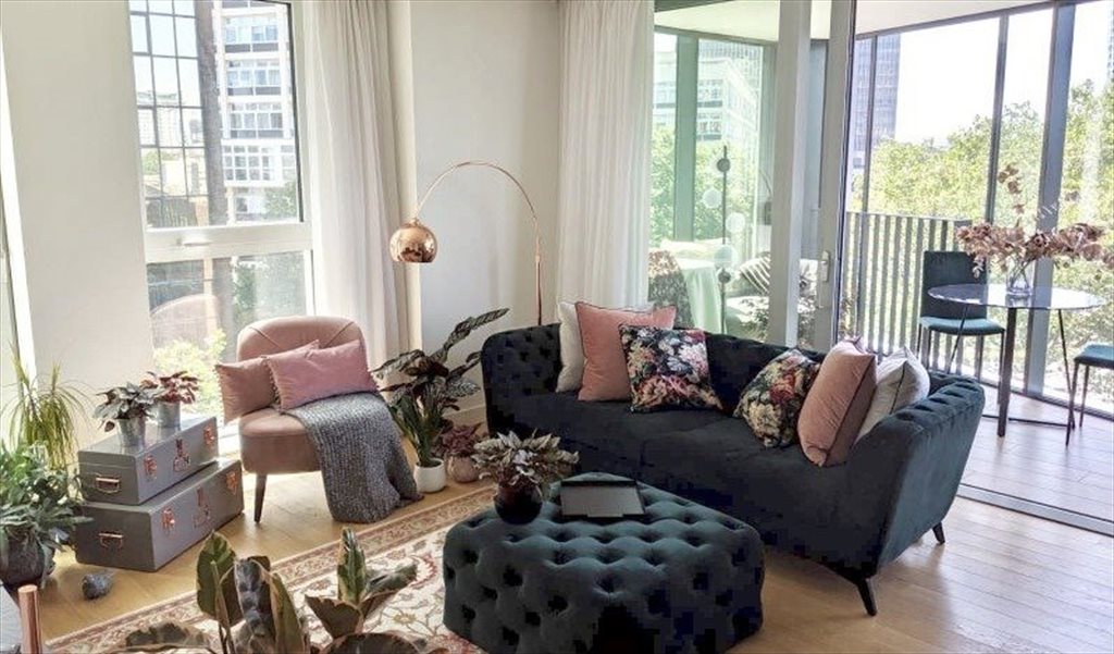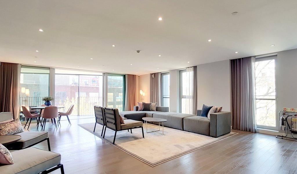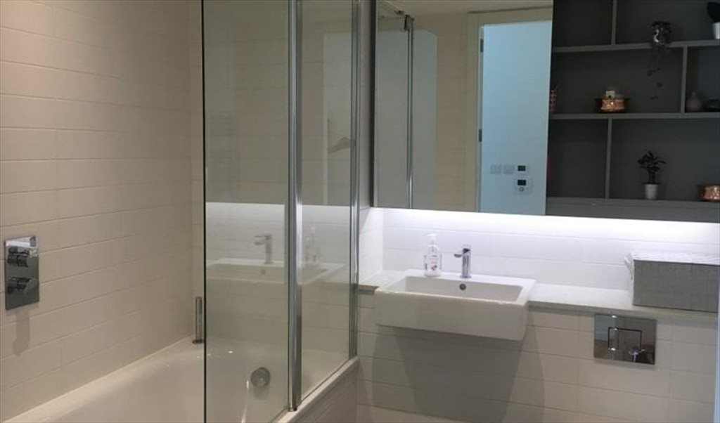 This flat features a full-length enclosed balcony (winter garden) with tranquil views from sunrise to sunset over Southwark’s vibrant skyline. It includes a large open-plan kitchen and living area with all standard built-in appliances.