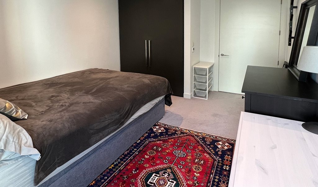 The bedroom features a large built-in wardrobe, queen bed with under-bed storage, chest of drawers, and a desk. You’ll also have use of a semi en-suite bathroom.
