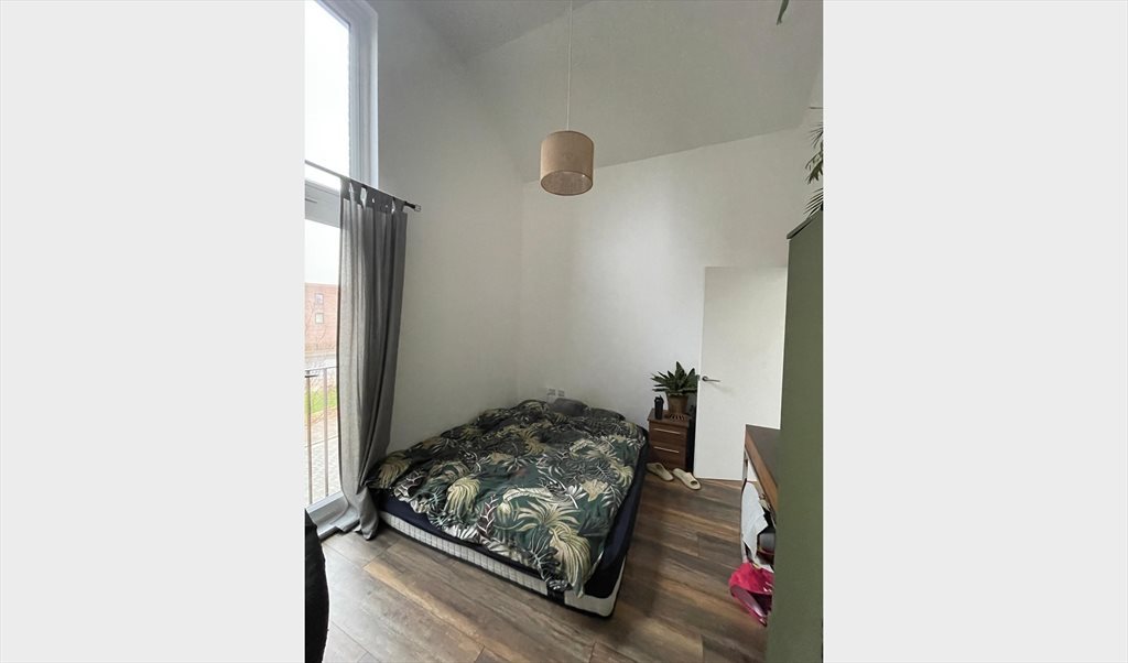 The room feels very spacious thanks to high ceilings (around 4 metres) and a large floor-to-ceiling balcony window, which brings in plenty of natural light.