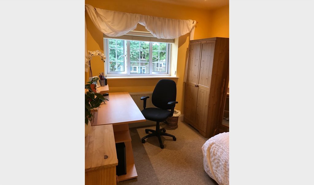 The room comprises : bed and bedside table, wardrobe, chest of drawers, computer table and chair. Blinds at window. Good lighting.