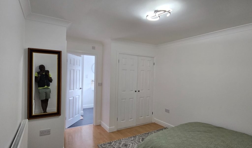 A spacious king-size en-suite bedroom with its own private bathroom. The room is spotless, with an integrated wardrobe, king-size bed and plenty of room for a desk if you work from home.