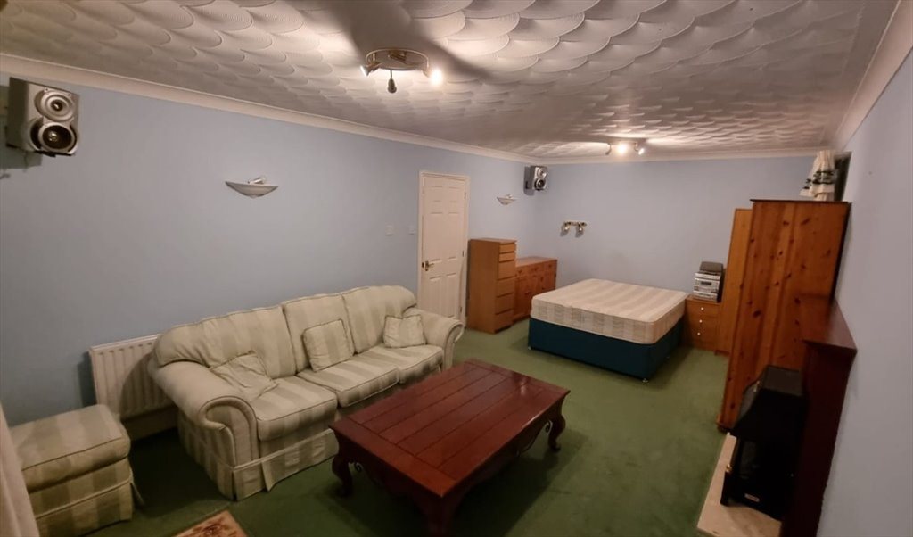 The room itself is very large, with sliding doors leading onto the garden, with two double wardrobes, a chest of drawers, a good double bed, a large coffee table, a sofa, etc. The room is carpeted and painted in neutral tones, with plenty of light.