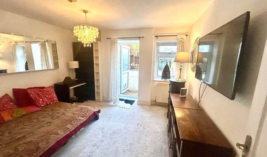This is a furnished. a large double room with study/work area and external window and door with direct access to back garden. You can furnish with your own picture etc.