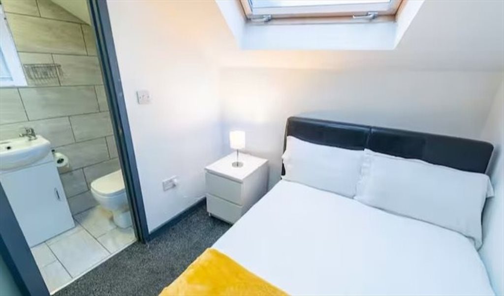 There is one bathroom, which has a toilet and sink and a walk-in shower.