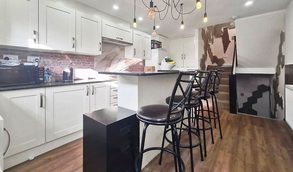 The property comprises wood laminate flooring, modern décor, fully fitted en-suite shower rooms with wash hand basins and WCs, retro lighting, and a fitted basic light-use open-plan kitchen. There is also a communal kitchen available for daily use, featuring a washing machine, fitted oven, hob, and sink with a drainer.