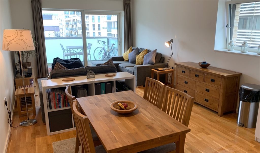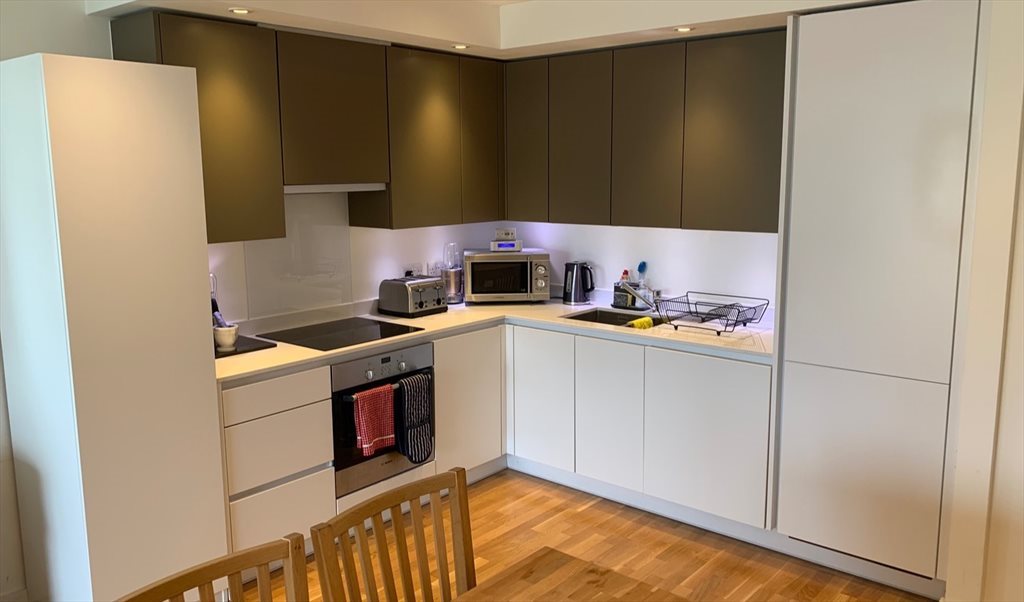 The living room and kitchen are fully furnished, but the bedroom is unfurnished, aside from built-in wardrobes (you may be able to purchase bedroom furniture from the departing tenant at additional cost).