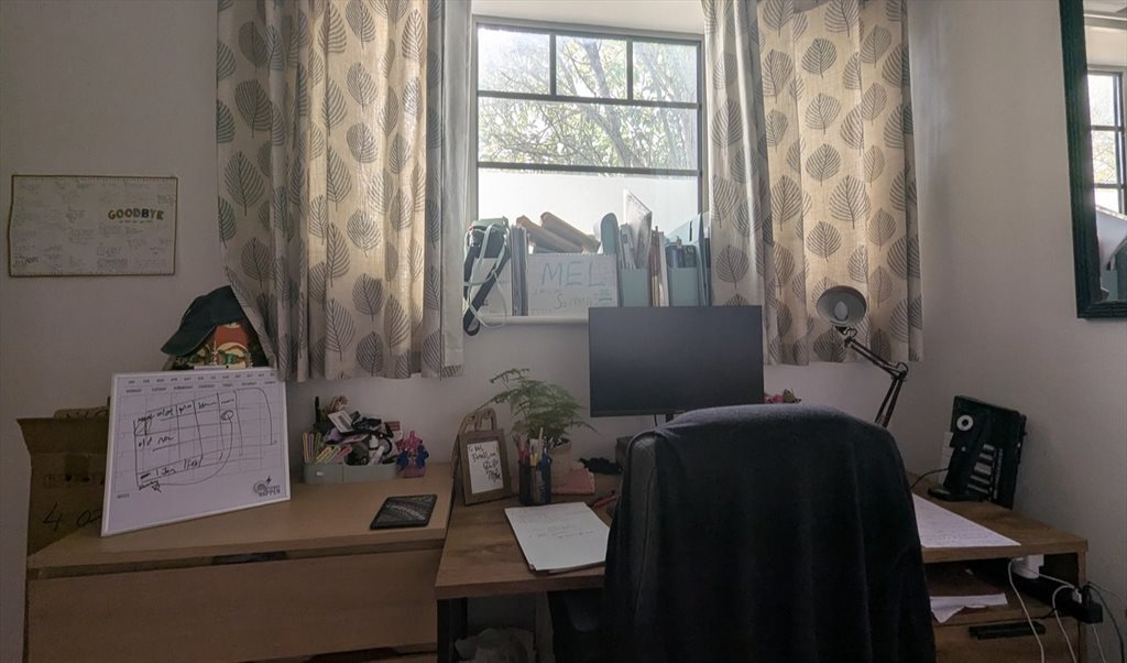 The room I'm offering is about 3x4m so quite spacious. It has a double bed with drawers underneath, a wardrobe and a set of drawers which already offers a lot of storage space. I also managed to fit a large desk and an extra set of drawers but those are coming with me.