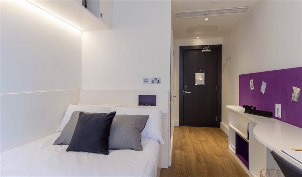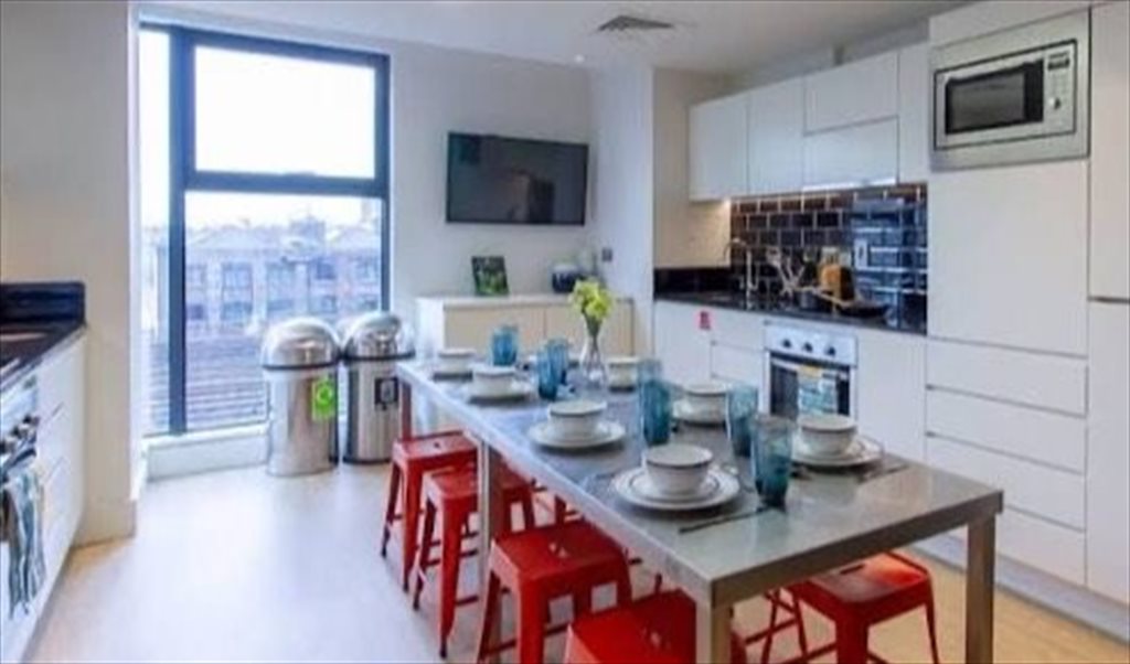 En-suite room with large shared kitchen with 7 other students. All flatmates are very warm, welcoming and clean. The room is spacious with lots of storage and a clean modern bathroom. The communal area includes a table tennis table, gaming stations, foosball, a cinema room, gym, pool and study spaces. As well as a large outdoor area.