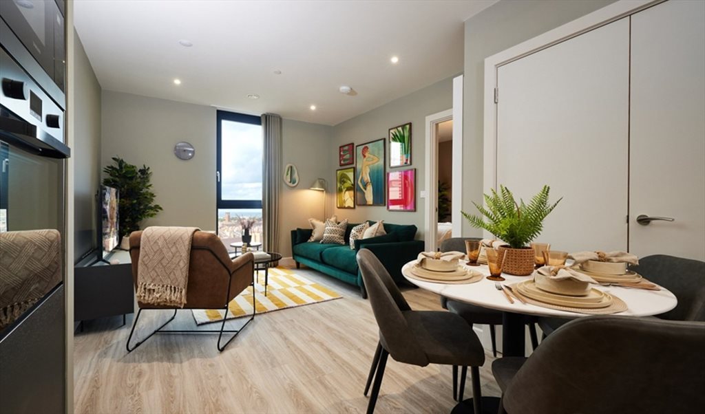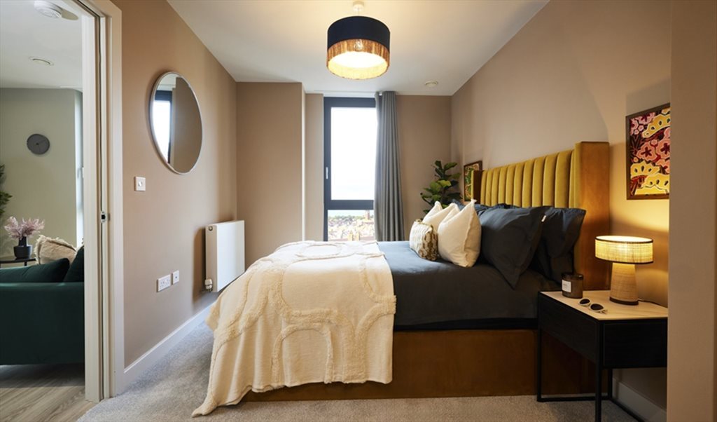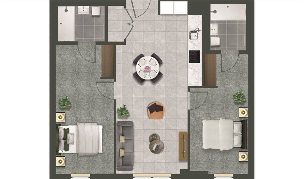Modern 2-bed apartment with two equal-sized en-suite bedrooms positioned on opposite sides of an open-plan living space, giving good privacy and no shared bedroom walls.